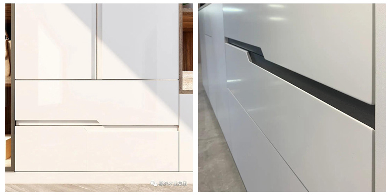 45°角的內向斜切,25mm槽寬,隱形的凹槽式拉手化有形于無形,符合人體工程學,保證每次柜門開合時的舒適手感。