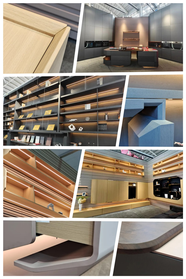 鋼琴格柵、45度斜邊收口、“三明治”板材工藝及非規則圓弧設計……多元美學融合,呈現全新家居意境。應用上,ENF級環保,4.5米通頂家居,第三代顆粒板、碳晶飾面板……為與會觀眾帶來高顏值、高個性化、高品質的整家美學方案。